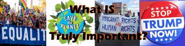 What do people and society think is really important in this world? It might be politics, policies, and attacking people that they despise. For others it might be unfair labor or trade practices, social justice, the environment, diversity, reproductive rights, the economy, sexual rights, immigration, homelessness, child trafficking, drug laws or a host of other societal or personal issues.